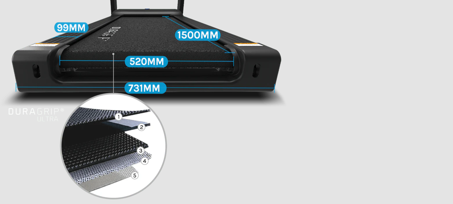 The commercial grade, innovative groove belt maximizes grip and durability for safe and long lasting high end performance. DuraGrip® belts have anti-static properties and noise reducing material to ensure a pleasant walk, jog or run.