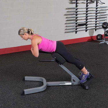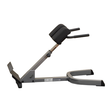 The Body Solid 45• Hyper Extension combines inverted back extension and oblique flexor set at an exact 45° angle for ultimate conditioning. Strengthen your lower back safely and comfortably on the strongest 45° Hyper available. This combination Inverted Back Extension and Oblique Flexor is set to an exact 45° angle for optimum conditioning. Telescoping midsection pads adjust to all size users and feature thick, double stitched DuraFirm"! pads for comfort and support.