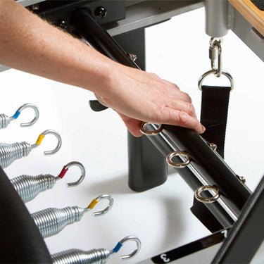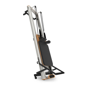 The Peak Pilates Reformer leads the way in innovation and is the only reformer in its class that can stand on-end with no removable parts. The fit reformer includes a locking foot bar, a four position one-hand gear bar, alignment graphic for student and instructor, as well as an integrated side-split platform with the ability to add a jump board.