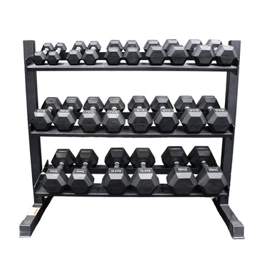 Save money and space with the Xpeed 165kg Dumbbell Set + 3 Tier Rack Package. It's perfect for your at home gym or small fitness facility as it allows you to create a tidy and professional looking space. The 1m tray is suitable for Hex and Commercial dumbbells. Assembly for the rack is required but is an easy and straightforward process to complete.