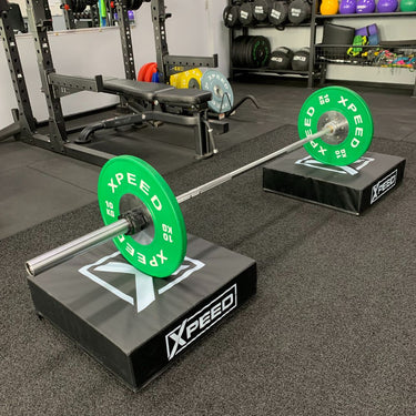 Place the drop pads securely on the ground, positioned underneath your barbell sleeves, this will allow you to load the barbell with your bumper plates and get a feel for the position of the pads. Ensure that there is enough space between you and the drop pads to perform your lifts safely, if not adjust accordingly. The bumper plates should sit in the middle of the pads.