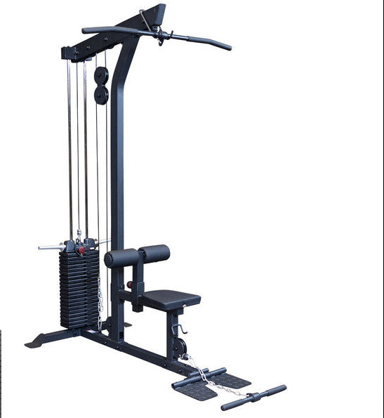 The Body Solid Pro Lat Machine lets you finish your lat workout with a 20 inch seated row bar instead of a massive 48 inch. Features included patented nylon bushings to provide super-smooth movements. Pop pin adjustments, foam rollers and bar holders for high and low pulleys add order and convenience to your workout. A seated row foot brace and diamond plate stabilizers add extra balance and security to the best lat machine on the market today.